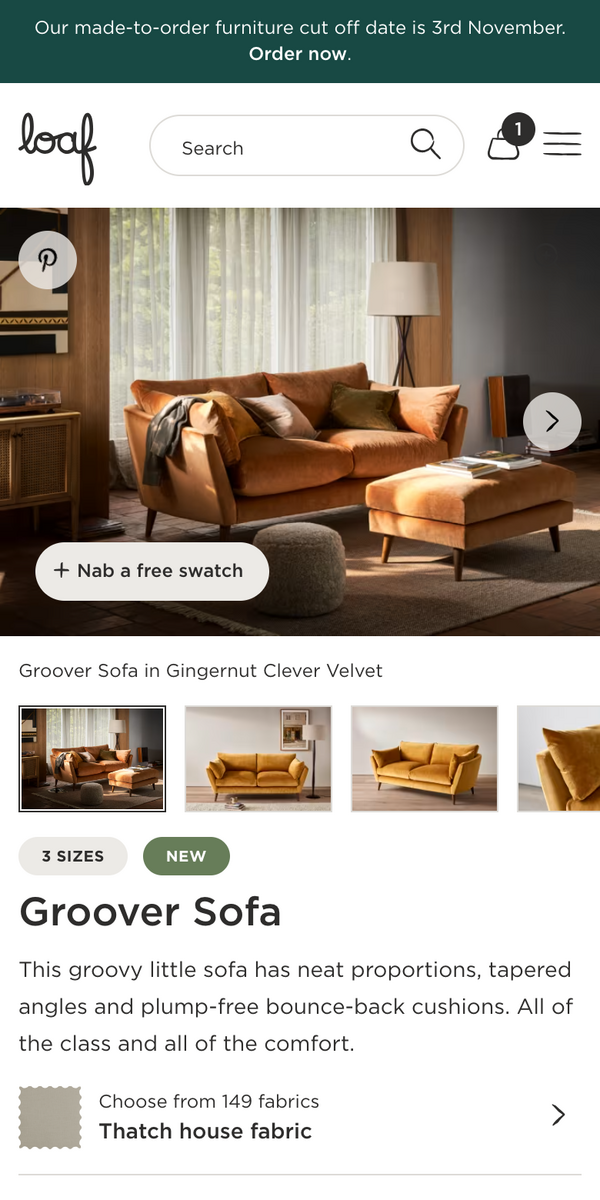 Hundreds of fabrics and dozens of customisable sofa designs means the total number of 'products' Loaf offers is in the tens of thousands. D3R built a site that could handle the complexity of their unique catalogue—including a massive increase in the number of available fabrics.